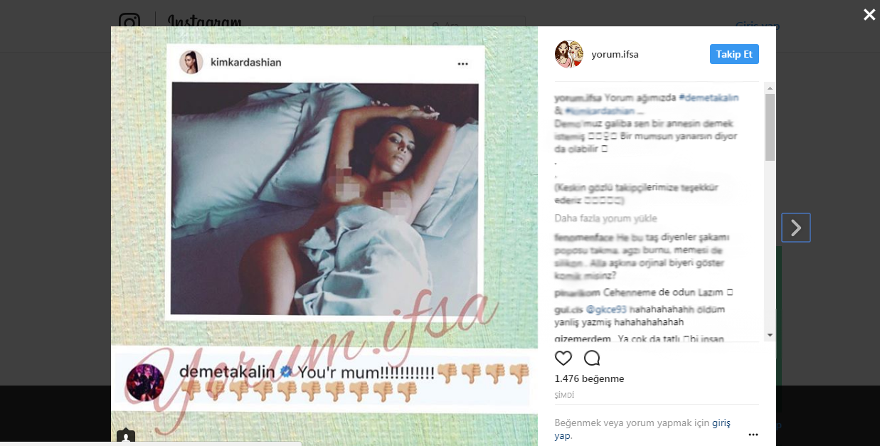 Kim Kardashian sosyal medya hesabından çıplak bir fotoğrafını paylaştı. Demet Akalın ise bu fotoğrafa oldukça kızdı ve yorum yapmaktan kaçınmadı. Demet Akalın, Kim Kardashian’ın fotoğrafının altına “you’r mum!!!!!” yorumunu yaparak anne olduğunu hatırlattı.