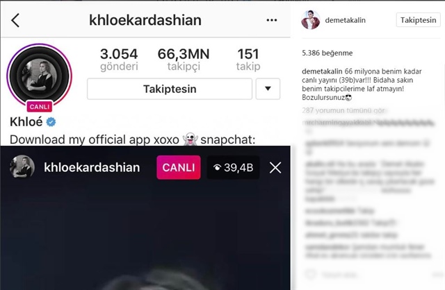66 milyondan fazla takipçisi bulunan Khloe Kardashian’ın canlı yayınını sadece 39 bin kişi izledi. Canlı yayın esnasında yorum bölümünde bazı Khloe Kardashian takipçileri, Demet Akalın’ın takipçilerine sataştılar.Demet Akalın, paylaşımının altına “66 milyona benim kadar canlı yayını (39b)var!!! Bi daha sakın benim takipçilerime laf atmayın! Bozulursunuz” notunu düşmüştü.