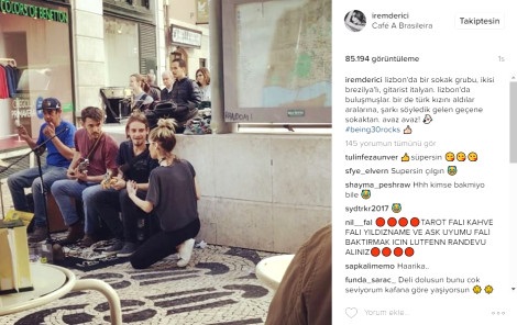 İrem Derici, şarkı söylediği anları sosyal medya hesabından “Lizbon’da bir sokak grubu, ikisi Brezilyalı, gitarist İtalyan. Lizbon’da buluşmuşlar. Bir de Türk kızını aldılar aralarına, şarkı söyledik gelen geçene sokaktan. Avaz avaz!” notu ile paylaştı.