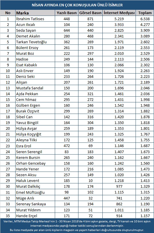 MTM’nin her ay düzenli olarak hazırladığı rapora göre, İbrahim Tatlıses ay boyunca gündemde kalarak en çok konuşulan ünlü oldu. Tatlıses, Cumhurbaşkanı Recep Tayyip Erdoğan’ın daveti üzerine ‘Zeytin Dalı Harekâtı’na destek için Hatay’a giden sanatçılar arasında yer alan isimlerdendi. Ziyaretin ardından Demet Akal’ın ile girdiği polemikle de bir süre gündemden düşmedi. Son günlerde ise Tatlıses, İzmir’den AK Parti’den aday adayı olmasıyla çok konuşuldu. Cumhurbaşkanı Erdoğan ile birlikte Zeytin Dalı Harekatı’na destek vermek için Hatay’a giden isimlerden biri de Seda Sayan, birçok başlıkla en çok konuşulan ünlü isimlerden oldu. Eski sevgilisinin adının Deniz Seki ile aşk dedikodusuna karışması gibi başlıklarla da adından söz ettirdi. Yaptığı açıklamalarla magazin gündeminden düşmeyen Demet Akalın, İbrahim Tatlıses ile yaşadığı polemiğin yanı sıra eşi Okan Kurt’u evlenmeye nasıl ikna ettiğini anlatmasıyla da çok konuşuldu. Baba olmayı bekleyen Megastar Tarkan, çıktığı Avrupa turnesinde verdiği konserler ile adından söz ettirmeyi başardı. Hayranları ile buluşan ünlü popçunun 6 milyon lira kazandığı da konuşulanlar arasında yer aldı. Son günlerde Bülent Ersoy ile düet yaptığı “Ümit Hırsızı” şarkısı çok konuşulmuştu. “Ümit Hırsızı” şarkısında sorun çıktığı ve şarkının iptal olduğu iddiaları, Ersoy tarafından yalanlanmıştı. ünlü sanatçı Bülent Ersoy, 2 bin 553 haberin konusu olarak, çok konuşulan sanatçılar arasına girdi.