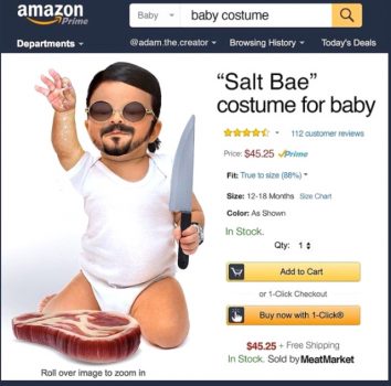 Gitgide büyümekte olan ve başarılarına başarı katan ünlü Kasap Nusret’in sosyal medyada gündemden düşmeyen ve insanlar tarafından örneklenen tuz dökme hareketinin resminin bulunduğu bir bebek kıyafeti tasarlanarak başarılı bir satış sitesi olan Amazon’da yerini aldı.