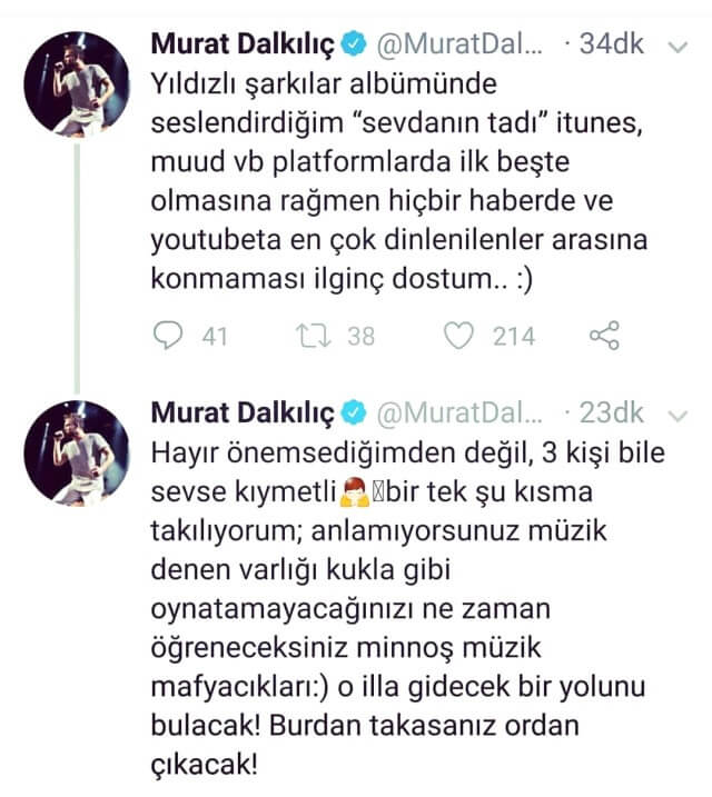 Ünlü şarkıcı Murat Dalkılıç, geçtiğimiz ay yayınlanan Yıldız Tilbe’nin 39 sanatçının yer aldığı “Yıldızlı Şakılar” albümünde “Sevdanın Tadı” isimli şarkıyı seslendirmişti. Dalkılıç’ın şarkısı listelerde ilk 5’te yer almasına rağmen en çok dinlenenler listesine alınmadı. Murat Dalkılıç, buna çok kızdı ve sosyal medya hesabından isyan etti.