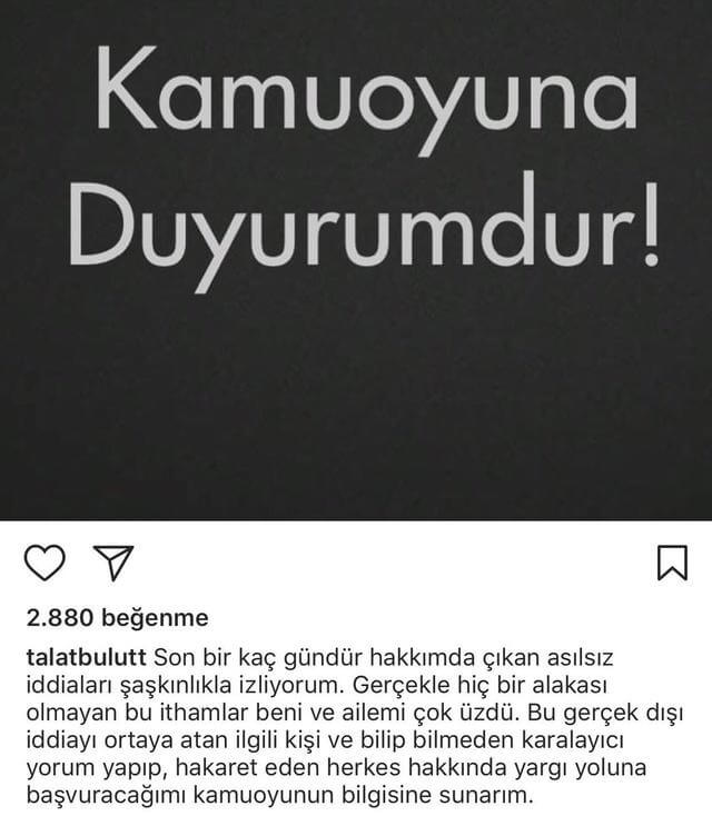 Taciz iddialarının ardından Talat Bulut sessizliğe gömülmüştü. Bulut, sonunda ilk açıklamasını yaptı. Az önce sosyal medya hesabından bir açıklama yayınlayan ünlü oyuncu, “Son birkaç gündür hakkımda çıkan asılsız iddiaları şaşkınlıkla izliyorum. Gerçekle hiç bir alakası olmayan bu ithamlar beni ve ailemi çok üzdü. Bu gerçek dışı iddiayı ortaya atan ilgili kişi ve bilip bilmeden karalayıcı yorum yapıp, hakaret eden herkes hakkında yargı yoluna başvuracağımı kamuoyunun bilgisine sunarım.” ifadelerini kullandı.