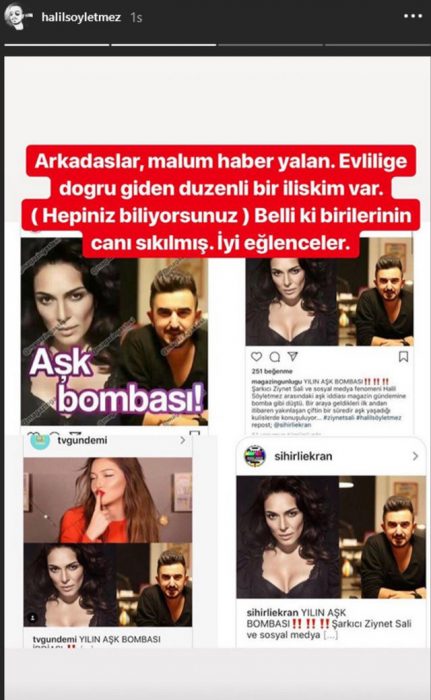 Halil Söyletmez ise şu anda evlilik yolunda çok ciddi bir ilişkisinin olduğunu söyleyerek “Arkadaşlar, malum haber yalan. Evliliğe doğru giden düzenli bir ilişkim var. (Hepiniz biliyorsunuz) Belli ki birilerinin canı sıkılmış. İyi eğlenceler.” yazısını yazdı.