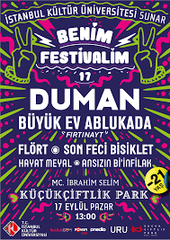Küçükçiftlik Park’ta 17 Eylül 2017 Pazar günü, gerçekleşecek olan Benim Festivalim, “Duman, Büyük Ev Ablukada, Flört, Son Feci Bisiklet, Hayat Meyal ve Ansızın Bi’İnfilak” gençlerle buluşacak.