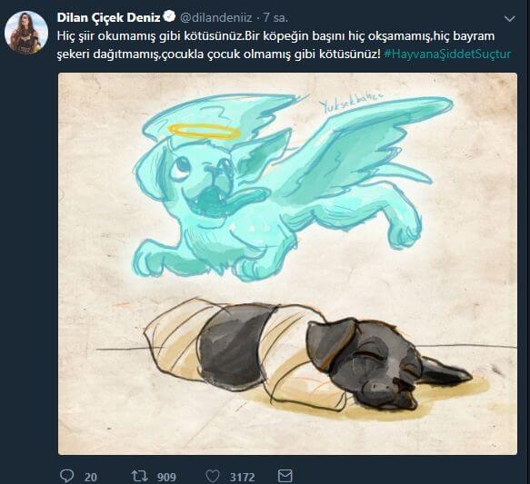 Son birkaç gündür Türkiye’de herkesi dehşete düşüren Sakarya’da dört patisi ve kuyruğu kesilmiş halde bulunan köpeğin ameliyat sırasında yaşamını yitirmesi herkesi çok üzmüştü.Üzüntünün yanı sıra öfke seli de sosyal medyadan yansımıştı. Bu olay kısa süre içinde sosyal medya gündemi oldu. Bu öfke seline katılanlar arasında Dilan Çiçek Deniz de bulunuyor.