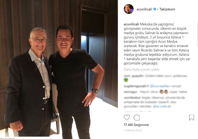 Acun Ilıcalı, Meksika’da yaptığı anlaşma haberini ise Instagram hesabından paylaştı. Acun ılıcalı “Meksika’da yaptığımız görüşmeler sonucunda, ülkenin en büyük medya grubu Salinas’la anlaşma yapmanın gururu içindeyiz. 3 yıl boyunca Azteca 1 kanalının tüm içeriğini Acun Medya üretecek. Bize güvenen ve kanalını emanet eden sayın Ricardo Salinas’a ve tüm Azteca medya grubuna teşekkür ediyorum. Azteca 1 kanalıyla yeni başarılar elde etmek için var gücümüzle çalışacağız.” diyerek başarısını takipçileri ile paylaştı. Türkiye’nin yanı sıra bir çok ülke için yarışma programları hazırlayan Acun Medya, başarılarını yurt dışına da taşıyor. Son yaptığı anlaşma ile Acun Ilıcalı, bu anlaşmanın karşılığında 150 milyon dolar alacağı duyumlar arasında yerini aldı…