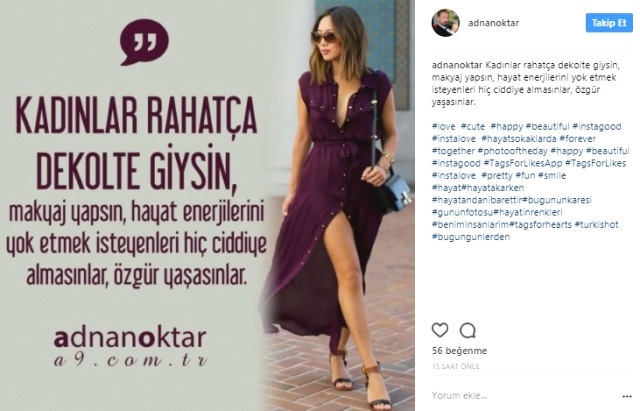 Sosyal medyada yaptığı paylaşım ile kadınlara çağrı yapan Adnan Oktar, paylaşımına “Kadınlar rahatça dekolte giysin, makyaj yapsın, hayat enerjilerini yok etmek isteyenleri hiç ciddiye almasınlar, özgür yaşasınlar.” çağrısını ekledi.