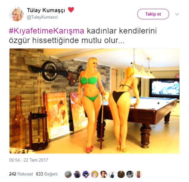 İşte Tülay Kumaşçı’nın “Kıyafetime karışma kadınlar kendilerini özgür hissettiğinde mutlu olur.” notu ile paylaştığı çok beğenilen o pozu…