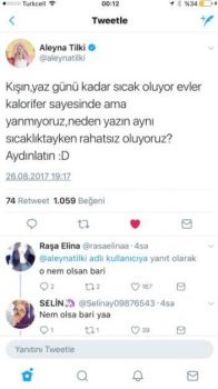 Popstarlık kariyerinin yanınıda aynı zamandada lise öğrencisi olan Aleyna geçmiş olduğumuz gün Twitter’daki binlerce takipçisine kafasına takılmış olan bir soruyu sordu. Aleyna’nın sorduğu soru böyledir “Kışın,yaz günü kadar sıcak oluyor evler kalorifer sayesinde ama yanmıyoruz,neden yazın aynı sıcaklıktayken rahatsız oluyoruz? Aydınlatın 😀”