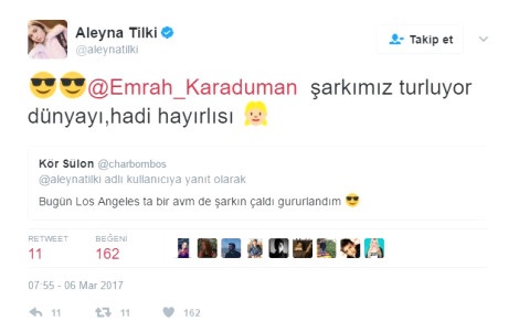 Genç şarkıcı, bir takipçisinin attığı “Bugün Los Angeles ta bir avm’de şarkın çaldı gururlandım.” tweet’ini Emrah Karaduman’ı da etiketleyip “Şarkımız turluyor dünyayı, hadi hayırlısı” notuyla retweet etti.