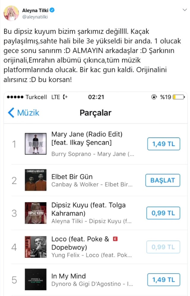 Aleyna Tilki, sanki kendi şarkısı gibi satışa sunulan sahte ‘Dipsiz Kuyum’ isimli şarkısının sahte satışları ile karşılaştı. Tilki, sahte şarkıya karşı sevenlerini uyardı. Sosyal medya hesabından sahte şarkı satışını ifşa eden Aleyna Tilki, şarkılarının sahtesinin de listede 3’üncü sırada olduğunu da vurguladı. Aleyna Tilki, ekran resmi ile birlikte yaptığı paylaşımlarda, şu ifadelere yer verdi: “Bu dipsiz kuyum bizim şarkımız değillll. Kaçak paylaşılmış,sahte hali bile 3e yükseldi bir anda. 1 olucak gece sonu sanırım. Almayın arkadaşlar 😀 Şarkının orijinali, Emrahın albümü çıkınca,tüm müzik platformlarında olucak. Bir kac gun kaldi. Orijinalini alırsınız 😀 bu korsan.”