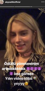Ödülü aldıktan sonra sosyal medya hesabı Instagram’dan hikaye paylaşımı yapan Aleyna,”Ödüllü yönetmenim artık.Ona göre.Yılın video klibi” notunu yazarak sevincini hayranlarıyla paylaştı.