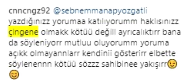 Takipçisi Özbir’e “Çingenelere benziyorsun” yorumunu yapınca Özbir “Sen kendine bak katana” diyerek çıkıştı. Ali Özbir, Çingenelere benzetilmesini hakaret olarak anlayıp tepki verince olandan oldu. Sosyal medyadan büyük bir tepki toplayan Ali Özbir’in diğer takipçileri “Çingenelere kurban ol sen” yorumları ile Özbir’e tepki gösterdi.