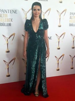 Gecede bir diğer dikkat çeken isim ise Songül Öden’di. Saçlarında farklı bir tarzla görülen ve bugüne kadar tercih etmiş olduğu saç tasarımlarından farklı bir seçim yapan Songül Öden, yeşil kıyafetiyle de yine oldukça iddialıydı.