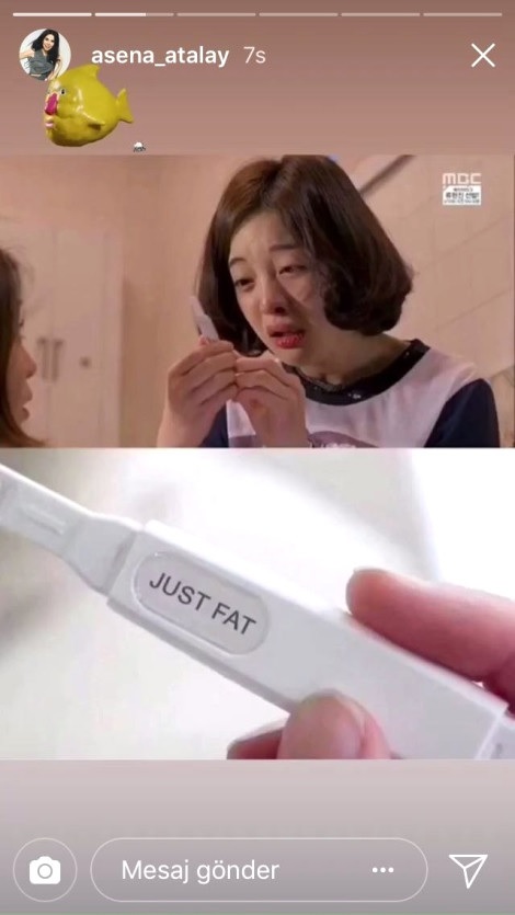 Asena Atalay, sosyal medya hesabında bir kadının hamilelik testi yaptığı ve testin üzerinde ‘sadece yağ’ yazdığı bir fotoğraf paylaştı. Atalay’ın Instagram hesabının hikayeler kısmında paylaştığı bu fotoğraf, eski eşi Caner Erkin’in hamilelik haberi duyulan eşi Şükran Ovalı’ya gönderme olarak düşünüldü. Paylaşımı görenler, “Şükran’ın hamileliğini hazmedememiş.” şeklinde yorumladılar.