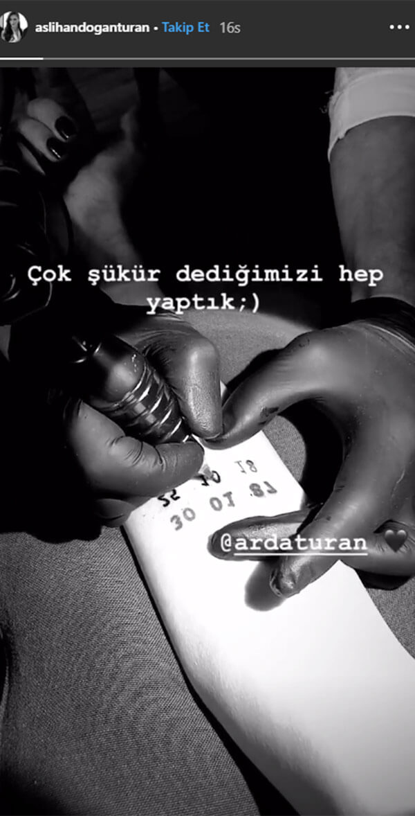 Aslıhan Doğan, daha önce de Arda Turan’ın doğum tarihini koluna yazdırmıştı. Aslıhan Doğan, bebeği Hamza Arda’nın doğum tarihini koluna dövme yaptırırken çektiği videoyu sosyal medyada yayınladı. Aslıhan Doğan, instagram’ın hikaye bölümünden yaptığı paylaşıma, “Çok şükür dediğimizi hep yaptık” notunu ekledi…