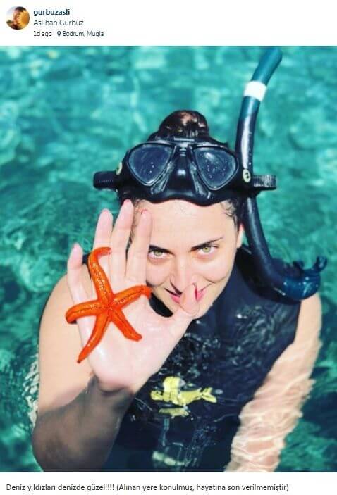 Aslıhan Gürbüz, önceki gün Bodrum’da tatil yaparken görüntülendi. Dizideki Merve’den çok etkilenmiş olacak ki, elindeki Denizyıldızı ile derin bir mesaj verdi…Gürbüz, su üstünde deniz yıldızıyla poz verdi. Oyuncunun “Denizyıldızları denizde güzel. Yerine konulmuş, hayatına son verilmemiştir” notuyla paylaştığı fotoğraf sosyal medya hesabından çok beğenildi.
