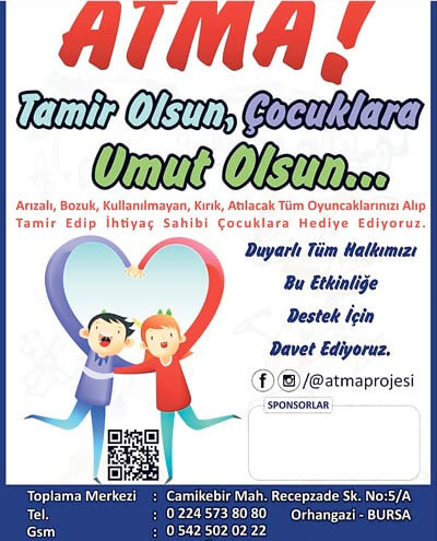 “Altın kalpli insanlar hâlâ var” dedirten projeden, Özgür Aras’tan gelen mesajla haberim oldu… Bursa’da anne-oğul Şükriye ve Muammer Kavazoğlu, bugüne kadar 2 bin 50 eski oyuncağı toplayıp, yıkayıp, tamir etmiş ve yenileyip, paketleyerek kimsesiz çocuklara, okullara hediye yollamışlar. Hedefleri miniklere