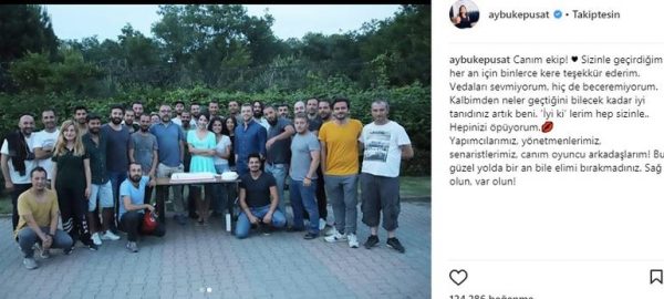 “Canım ekip! Sizinle geçirdiğim her an için binlerce kere teşekkür ederim. Vedaları sevmiyorum, hiç de beceremiyorum. Kalbimden neler geçtiğini bilecek kadar iyi tanıdınız artık beni. ‘İyi ki’ lerim hep sizinle.. Hepinizi öpüyorum.Yapımcılarımız, yönetmenlerimiz, senaristlerimiz, canım oyuncu arkadaşlarım! Bu güzel yolda bir an bile elimi bırakmadınız. Sağ olun, var olun…