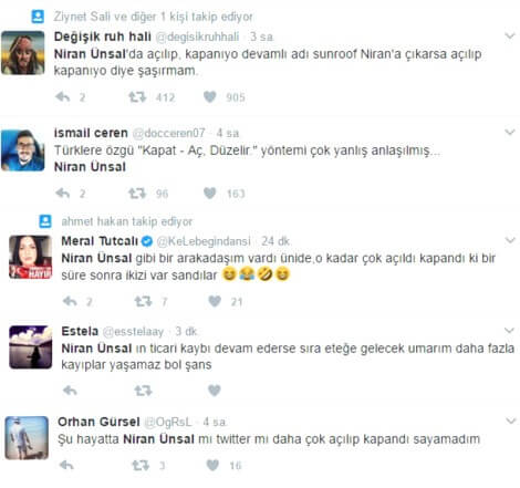 Niran Ünsal’ın tesettürünü çıkarması sosyal medyadan tepki aldı. Ünsal’ın başını bir açıp bir kapadığını söyleyen sosyal medya kullanıcıları, ünlü şarkıcıya alaycı paylaşımlar ile tepki gösterdiler.