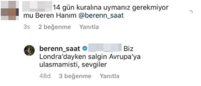 Kenan Doğulu ve Beren Saat, geçtiğimiz haftalarda Londra’ya tatile gitmişlerdi. Türkiye’ye döndükten sonra on dört gün yasağına uymadıkları için tepkileri üzerine toplayan çift sosyal medyadan eleştiri almaya devam ediyor. Bugün bir yoruma yanıt veren Beren Saat’in karantina açıklaması tepki topladı. İşte Beren Saat’in o açıklaması;