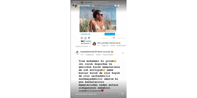 Sosyal medya hesabını aktif olarak kullanan Berfu Yenenler de bikinili fotoğraflarını sosyal medya hesabından paylaştı. 1 milyon takipçisi bulunan Berfu Yenenler’in bikinili fotoğrafına takipçilerinin bir kısmından şu açıklamayı yaptı;