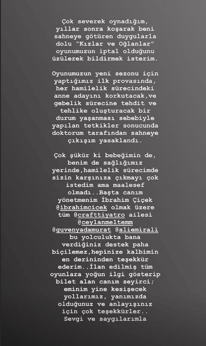 Bergüzar Korel, sosyal medya hesabından 2. hamileliği süresince sahnelerden uzak kalacağını duyurarak şöyle paylaştı;
