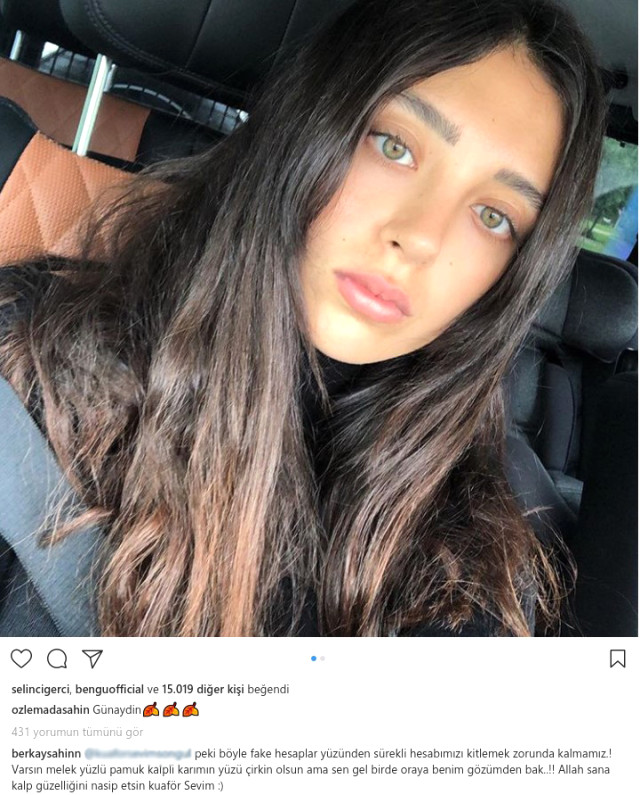 Berkay Şahin eşine yapılan yoruma, “Böye sahte hesaplar yüzünden hesabımızı kitlemek zorunda kalmamız! Varsın melek yüzlü pamuk kalpli karımın yüzü çirkin olsun ama sen gel bir de benim gözümden bak! Allah sana kalp güzelliği nasip etsin kuaför Sevim” cevabını verdi.