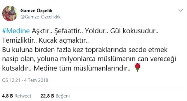 Paylaşımında geçirdiği ‘Medine’ ifadesinden dolayı hakkında soruşturma başlatılan Berna Laçin, son olarak Gamze Özçelik’in de eleştirisine maruz kaldı. Gamze Özçelik, kendi sosyal medya hesabından “#Medine Aşktır.. Şefaattir.. Yoldur.. Gül kokusudur.. Temizliktir.. Kucak açmaktır.. Bu kuluna birden fazla kez topraklarında secde etmek nasip olan, yoluna milyonlarca Müslümanın can vereceği kutsaldır. Medine tüm Müslümanlarındır.” şeklinde ifadeler kullandığı Berna Laçin’e göndermede bulunduğu düşünülen bir paylaşım yaptı.
