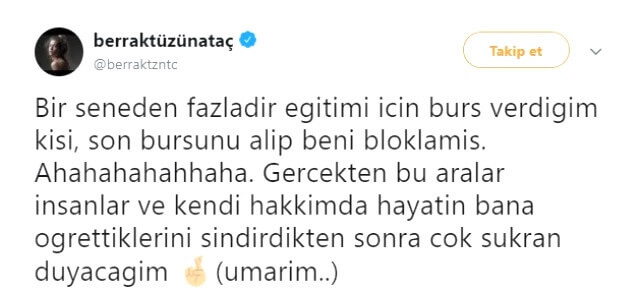 Berrak Tüzünataç, burs verdiği gencin kendisini engellediğini görünce yaşadığı şaşkınlığı sosyal medya hesabından şu şekilde anlatmıştı: Bir seneden fazladır eğitimi için burs verdiğim kisi, son bursunu alıp beni bloklamış (engellemiş). Gerçekten bu aralar insanlar ve kendi hakkımda hayatın bana öğrettiklerini sindirdikten sonra çok şükran duyacağım. Umarım.