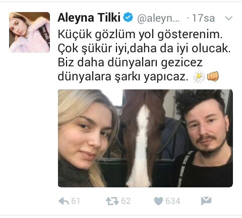 Olayı öğrenir öğrenmez Eskişehir’e giden ünlü şarkıcı Aleyna Tilki, Emrah Karaduman’ın sevenlerine sosyal medya üzerinden sağlık durumu hakkında bilgilendirme yapıyor. Emrah Karaduman ile ilgili bir paylaşımda bulunan Aleyna Tilki, paylaşımına “Küçük gözlüm yol gösterenim. Çok şükür iyi, daha da iyi olucak. Biz daha dünyaları gezicez dünyalara şarkı yapıcaz” notunu yazdı.