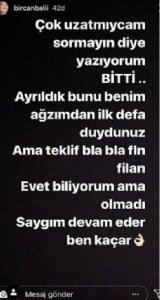 Magazin dünyasında lafını esirgemeyen yapısıyla ün salan Bircan Bali, geçtiğimiz temmuz ayında bu yıl aşk yaşadığı avukat Ömer Gezen’den evlilik teklifi aldığını duyurmuş, fakat ikili bu habarden çok kısa bir süre sonra aniden ayrılarak sevenlerini üzmüşlerdi.