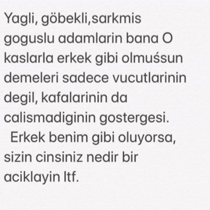 “Yağlı, göbekli, sarkmış göğüslü adamların bana “O kaslarla erkek gibi olmuşsun” demeleri sadece vücutlarının değil, kafalarının da çalışmadığının göstergesi. Erkek benim gibi oluyorsa, sizin cinsiyetiniz nedir, açıklayın lütfen!”