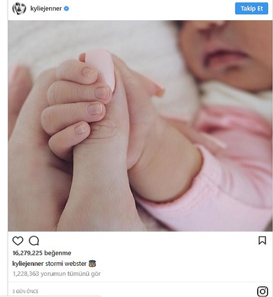 Kim Kardashian‘ın üvey kardeşi ve Kendall Jenner’in küçük kardeşi olan Kylie Jenner, geçtiğimiz günlerde ilk kez Intagram’da kızı Stormi’nin fotoğrafını paylaştı. Instagram’da 103 milyon takipçisi olan Kylie’nin bu paylaşımı; bir günde 15 milyondan fazla kişi tarafından beğenilerek yeni bir Instagram rekoruna imza attı. Kylie Jenner ve Travis Scott çiftinin kızları Stormi Webster’ın ilk paylaşılan fotoğrafı; ayrıca, 1 milyondan fazla yorum aldı. İşte; Jenner’ın, kızı Stormi’nin minik elinden tutarak çektirdiği ve rekor kırdığı fotoğrafı…