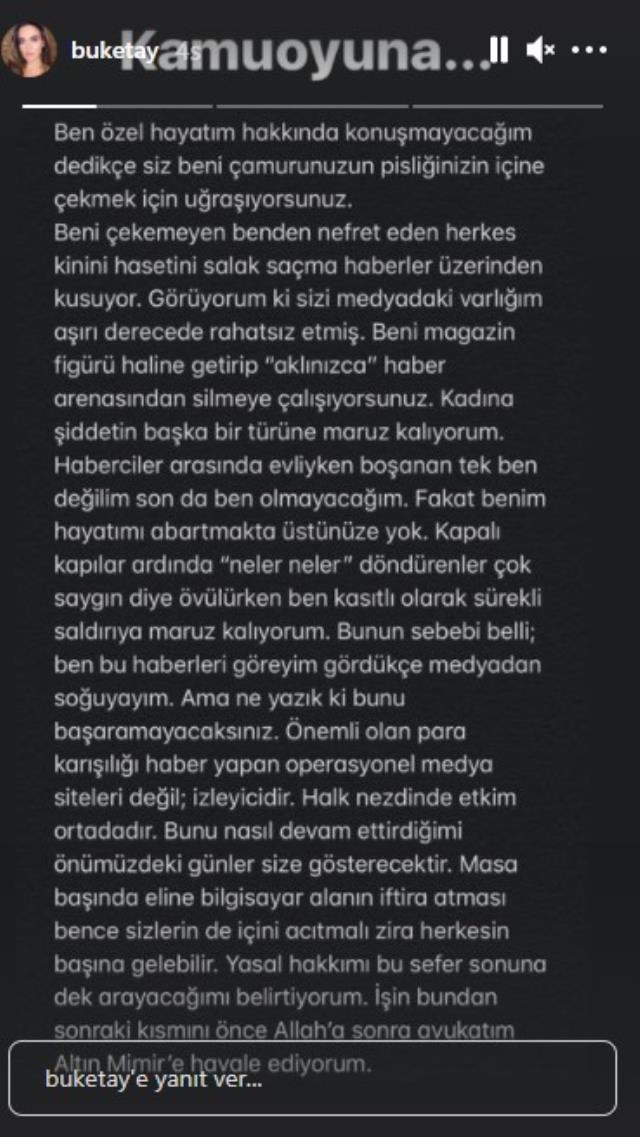 “Ben özel hayatım hakkında konuşmayacağım dedikçe siz beni çamurunuzun, pisliğinizin içine çekmek için uğraşıyorsunuz. Beni çekemeyen benden nefret eden herkes kinini hasetini salak saçma haberler üzerinden kusuyor. Görüyorum ki sizi medyadaki varlığım aşırı derecede rahatsız etmiş. Beni magazin figürü haline getirip “aklınızca” haber arenasından silmeye çalışıyorsunuz. Kadına şiddetin başka bir türüne maruz kalıyorum.”