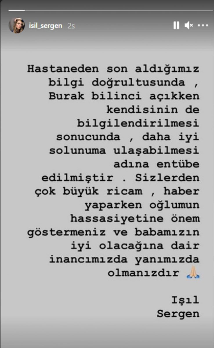Işıl Sergen paylaşımında “Hastaneden son aldığımız bilgi doğrultusunda Burak, bilinci açıkken kendisinin de bilgilendirilmesi sonucunda daha iyi solunuma ulaşabilmesi adına entübe edilmiştir” dedi.