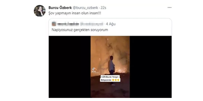 Burcu Özberk sosyal medya hesabından Özdemir’e tepki gösterdi. Özdemir’in görüntülerini paylaşan oyuncu “Şov yapmayın insan olun insan” paylaşımı yaptı.