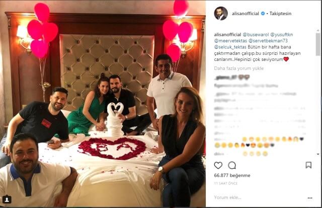 Alişan, Buse Varol ile birlikte kendisine sürpriz hazırlayan arkadaşlarına da “Bütün bir hafta bana çaktırmadan çalışıp, bu sürprizi hazırlayan canlarım.. Hepinizi çok seviyorum.” notu ile teşekkür etti.