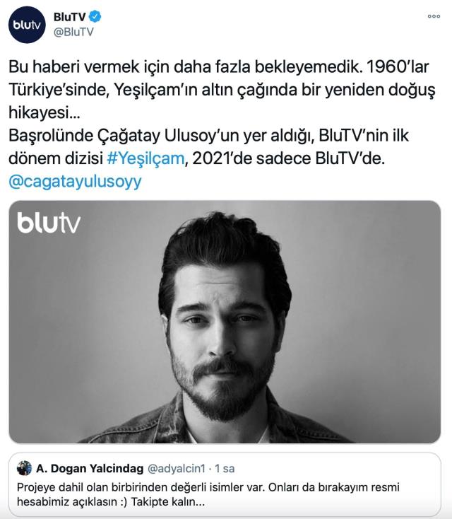 “Bu haberi vermek için daha fazla bekleyemedik. 1960’lar Türkiye’sinde, Yeşilçam’ın altın çağında bir yeniden doğuş hikayesi. Başrolünde Çağatay Ulusoy’un yer aldığı, BluTV’nin ilk dönem dizisi Yeşilçam, 2021’de sadece BlueTv’de..”