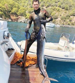 Özellikle bu fotoğrafı koymasının nedeni var; vurduğu balık öyle böyle değil, büyük bir kılıç balığı…