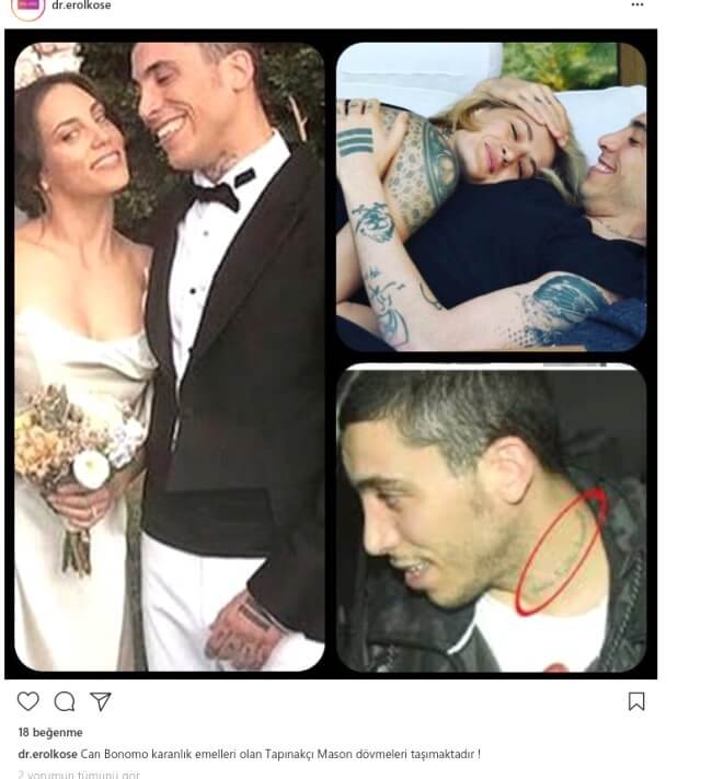 Sosyal medya hesabından Can Bonomo’nun fotoğrafını paylaşan ünlü yapımcı Erol Köse, Bonomo’nun boynundaki dövmeyi işaretleyerek “Can Bonomo karanlık emelleri olan Tapınakçı Mason dövmeleri taşımaktadır.” notunu yazdı.