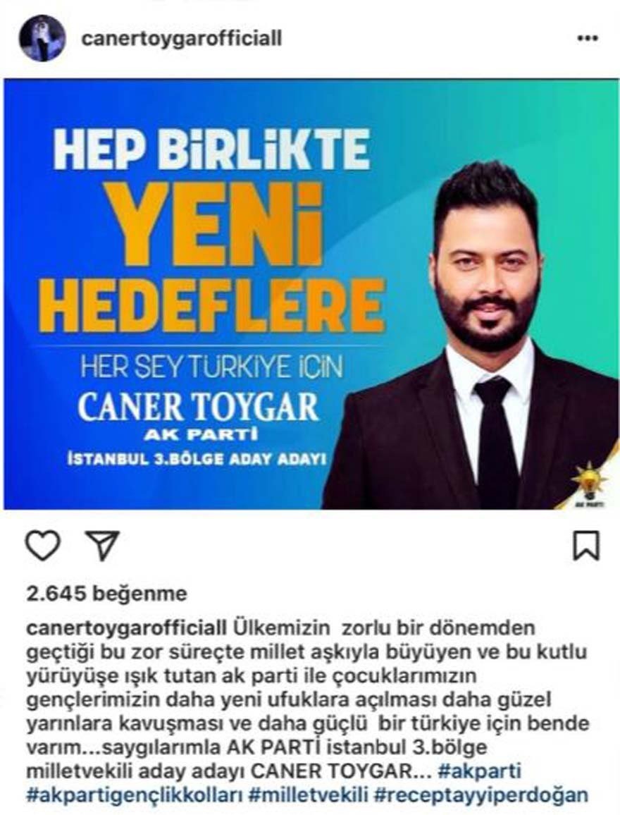 Caner Toygar sosyal medya hesabından bir resim paylaşarak, bir açıklama yaptı. Açıklama ise şöyle; “Ülkemizin zorlu bir dönemden geçtiği bu zor süreçte millet aşkıyla büyüyen ve bu kutlu yürüyüşe ışık tutan Ak Parti ile çocuklarımızın gençlerimizin daha yeni ufuklara açılması daha güzel yarınlara kavuşması ve daha güçlü bir Türkiye için bende varım…. saygılarımla Ak Parti İstanbul 3. Bölge Milletvekili Aday Adayı Caner Toygar”