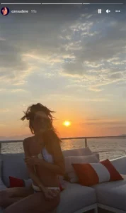 Gün batımında teknede objektif karşısına geçen 41 yaşındaki ünlü isim, bu kareyi takipçilerinin de beğenisine sundu. Fit haliyle dikkat çeken ve karışık renkli bir bikini tercih eden Dere’nin pozu büyük ilgi gördü.