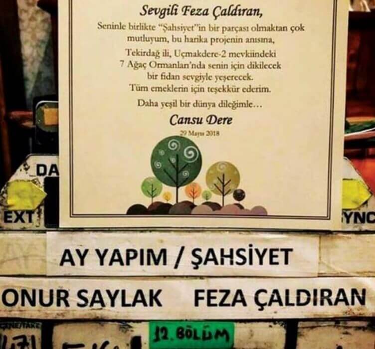 Cansu Dere, başrolü üstlendiği Şahsiyet dizisinin çalışma arkadaşları adına Tekirdağ 7 Ağaç Ormanları’na 118 adet fidan bağışladı. Daha sonra da bu bağışla ilgili bilgilendirme kartlarını da gönderdi. Dizinin görüntü yönetmeni Feza Çaldıran, bağış kartının bir fotoğrafını sosyal medyada paylaşarak Cansu Dere’ye şu sözlerle teşekkür etti: “Artık benim de bir dikili ağacım var. Teşekkürler Cansu Dere…” diyerek sosyal medya üzerinden teşekkür etti.