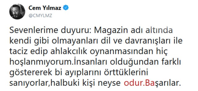 Ünlü komedyen Cem Yılmaz, son günlerde adı aşk dedikodularına karışan Defne Samyeli’nin evinde sabahladığı haberleri ile gündeme gelmişti. Yılmaz, iddialar hakkında sosyal medya hesabından açıklama yaptı. Yılmaz, açıklamasında “Sevenlerime duyuru: Magazin adı altında kendi gibi olmayanları dil ve davranışları ile taciz edip ahlakçılık oynanmasından hiç hoşlanmıyorum. İnsanları olduğundan farklı göstererek bir ayıplarını örttüklerini sanıyorlar, halbuki kişi neyse odur. Başarılar.” ifadelerine yer verdi.