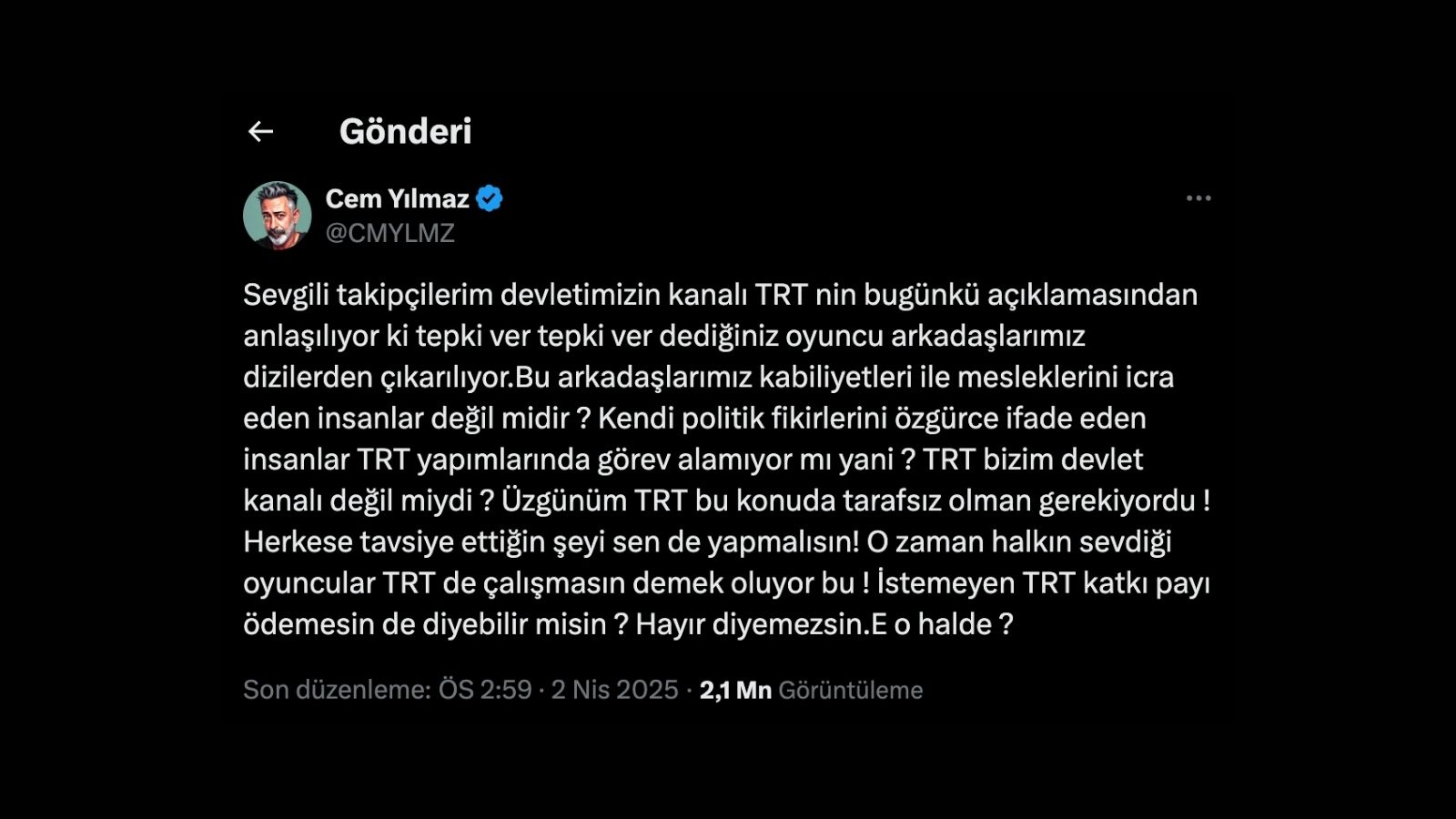 Cem Yılmaz, TRT’nin aldığı karara karşı çıkarak sosyal medya hesabından şu açıklamayı yaptı: