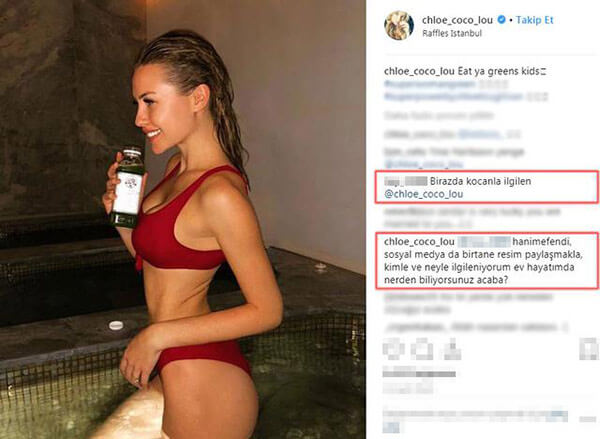 Ünlü model Chloe’nin önceki gün sosyal medya hesabından paylaştığı fotoğrafa bir takipçisi, “Biraz da kocanla ilgilen” şeklinde yorumda bulundu. Bu yoruma çok sinirlenen model Chloe Loughnan “Hanımefendi, sosyal medyada bir tane resim paylaşmakla, kimle ve neyle ilgileniyorum? Ev hayatımı nereden biliyorsunuz?” yorumumda bulunarak takipçisine patladı…