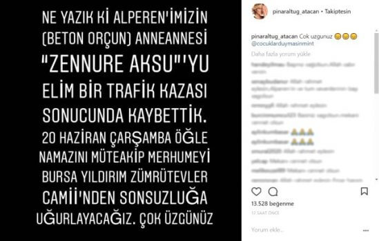 Alperen Khamis’in anneannesinin vefat haberini set arkadaşlarından Pınar Altuğ duyurdu. Sosyal medya hesabından paylaşım yapan Altuğ, “Ne yazık ki Alperen’imizin (Beton Orçun) anneannesi Zennure Aksu’yu elim bir trafik kazası sonucunda kaybettik. 20 Haziran Çarşamba günü öğle namazını müteakip merhumeyi Bursa Yıldırım Zümrütevler Camii’nde sonsuzluğa uğurlayacağız. Çok üzgünüz.” notunu yayınladı.