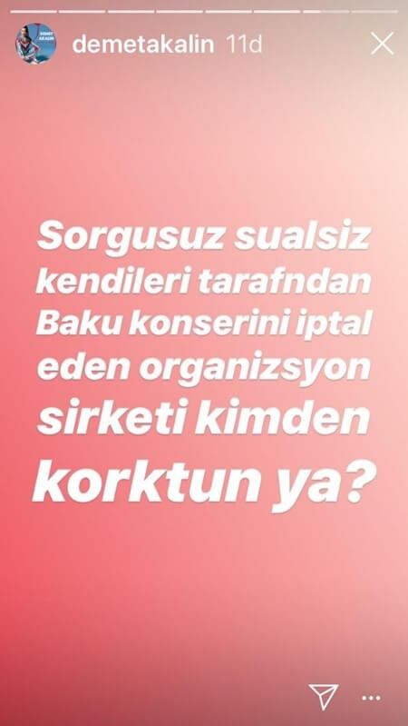 Bakü konseri iptal edilen Demet Akalın, sosyal medya hesabından ateş püskürdü. Konserin organizasyonunu yapanlara seslenen Akalın, sosyal medya hesabından yaptığı paylaşımda “Sorgusuz, sualsiz kendileri tarafından Bakü konserini iptal eden organizasyon şirketi kimden korktun ya?” ifadelere yer verdi.